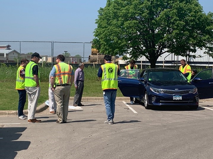 In May, principal investigator, Michael Levin, and co-investigator, Zongxuan Sun, with the University of Minnesota, provided the technical advisory panel a demonstration to simulate the device in real time on Scott County’s Hwy 18 and 21 intersection. Inside the vehicle, the onboard unit receives SPaT and map information from the roadside unit and broadcasts basic safety messages to drivers.