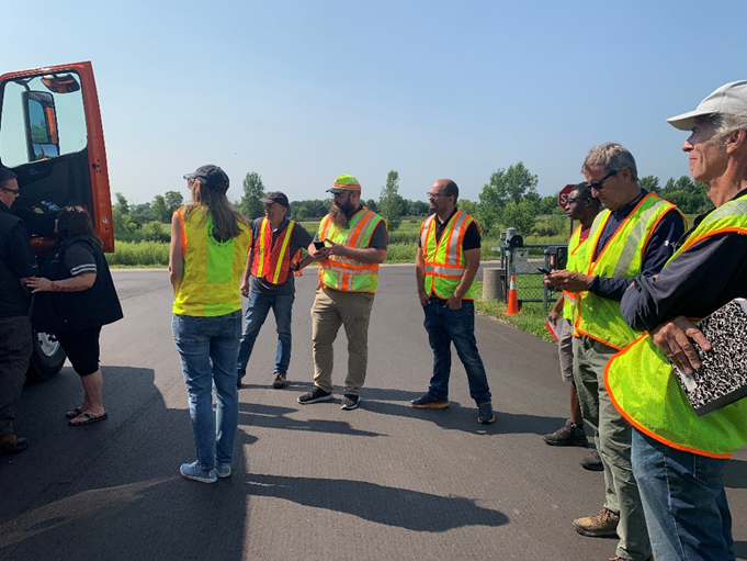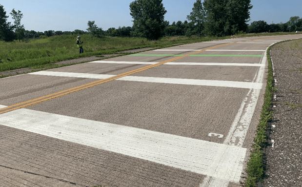 On July 25th, members of the technical advisory panel met at MnROAD, MnDOT’s pavement test track, in Otsego, MN to test different friction aggregates applied to pavement markings and colored pavements. Operators drove a surface friction tester known as SCRIM or the Sideway Force Coefficient Routine Investigation Machine, over the test strips multiple times at different speeds to measure the friction of each strip. Watch the SCRIM in action, in this video from WDIO-Duluth.