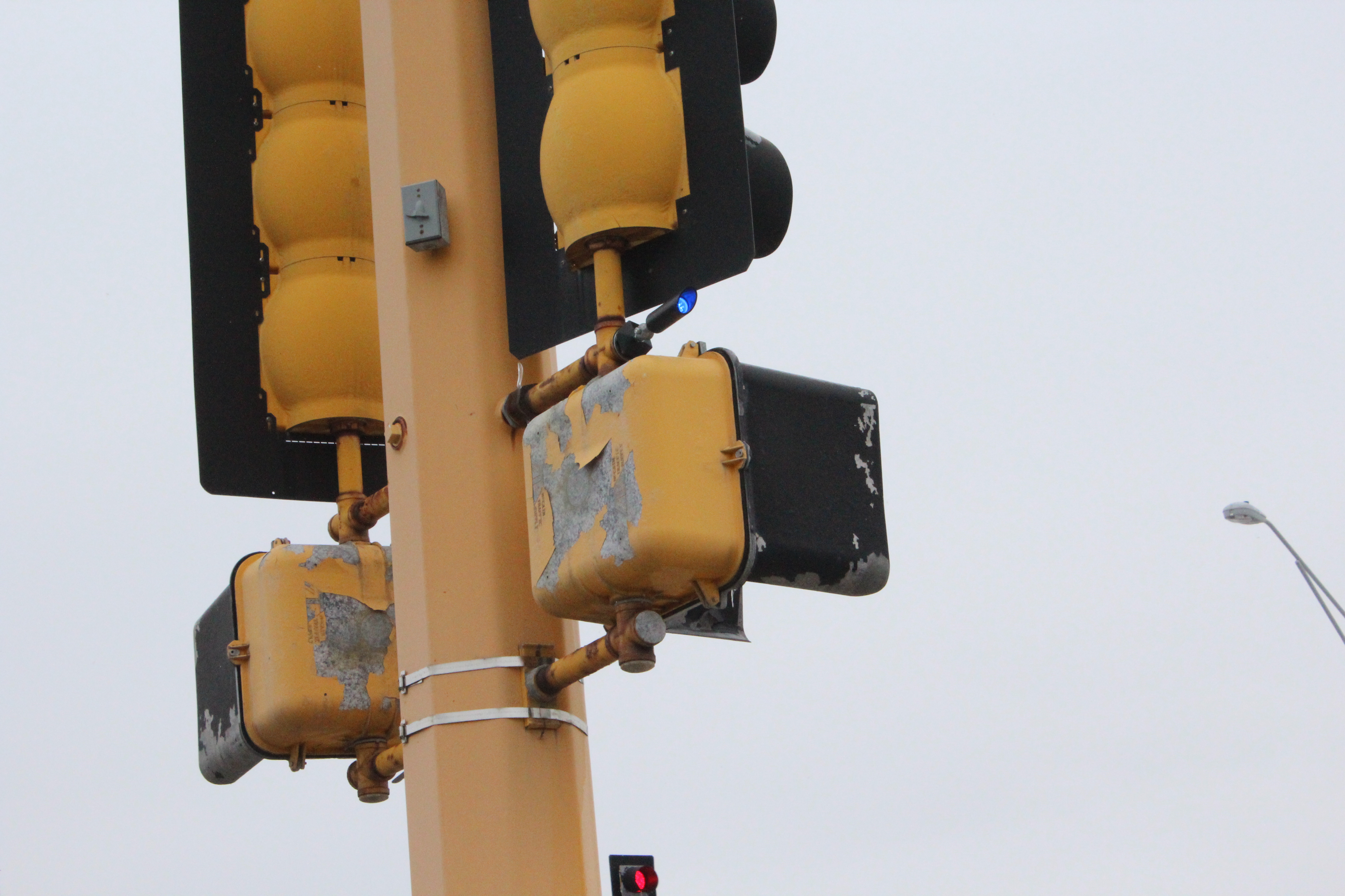 A blue light, positioned on each of the four corner intersection poles, turn on whenever the opposite signal light turns red.