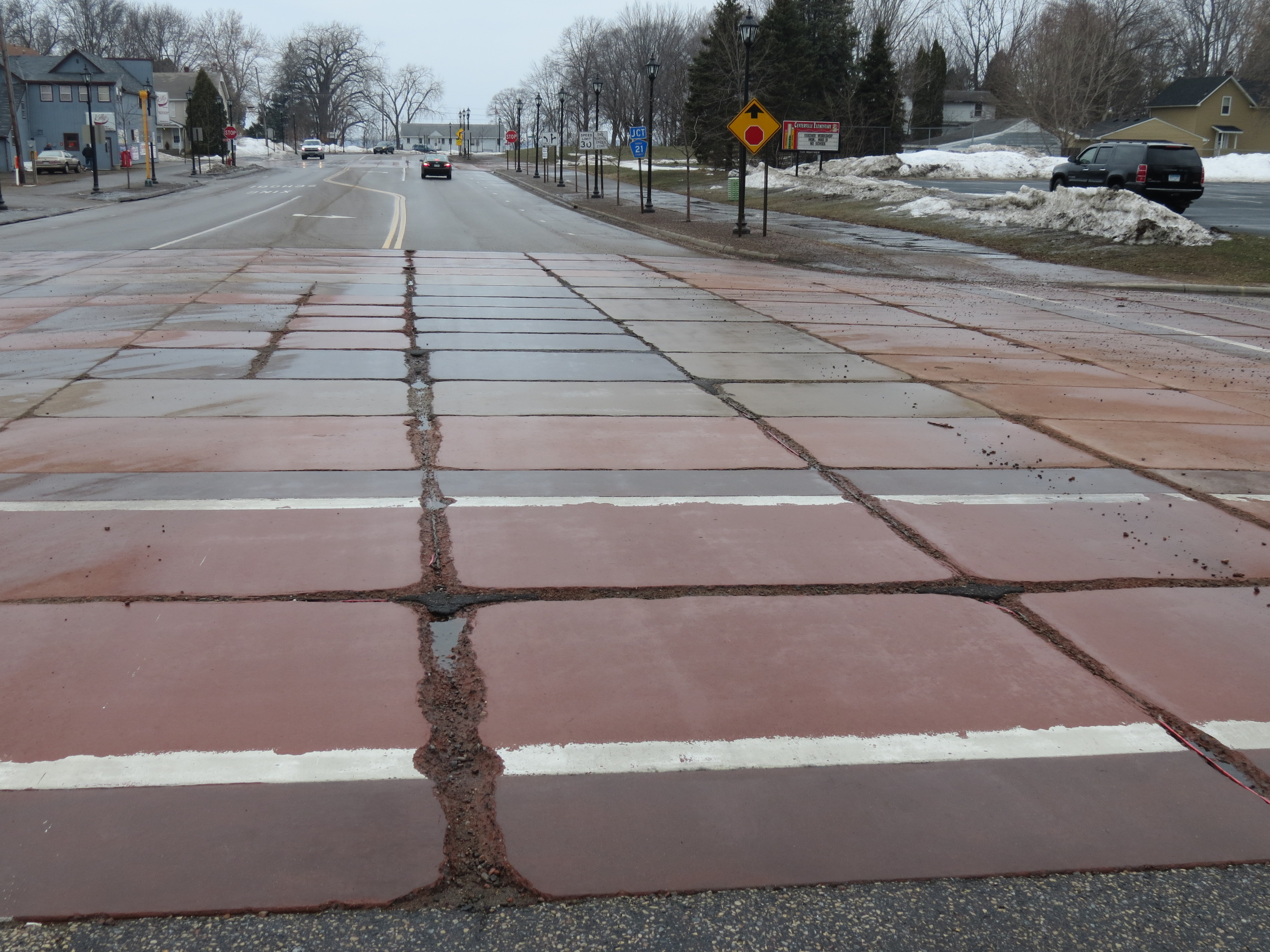 The city of Stillwater, which installed a colored concrete panel crosswalk on its main street just two years ago (see top photo), is already experiencing cracking and deterioration in several panels.